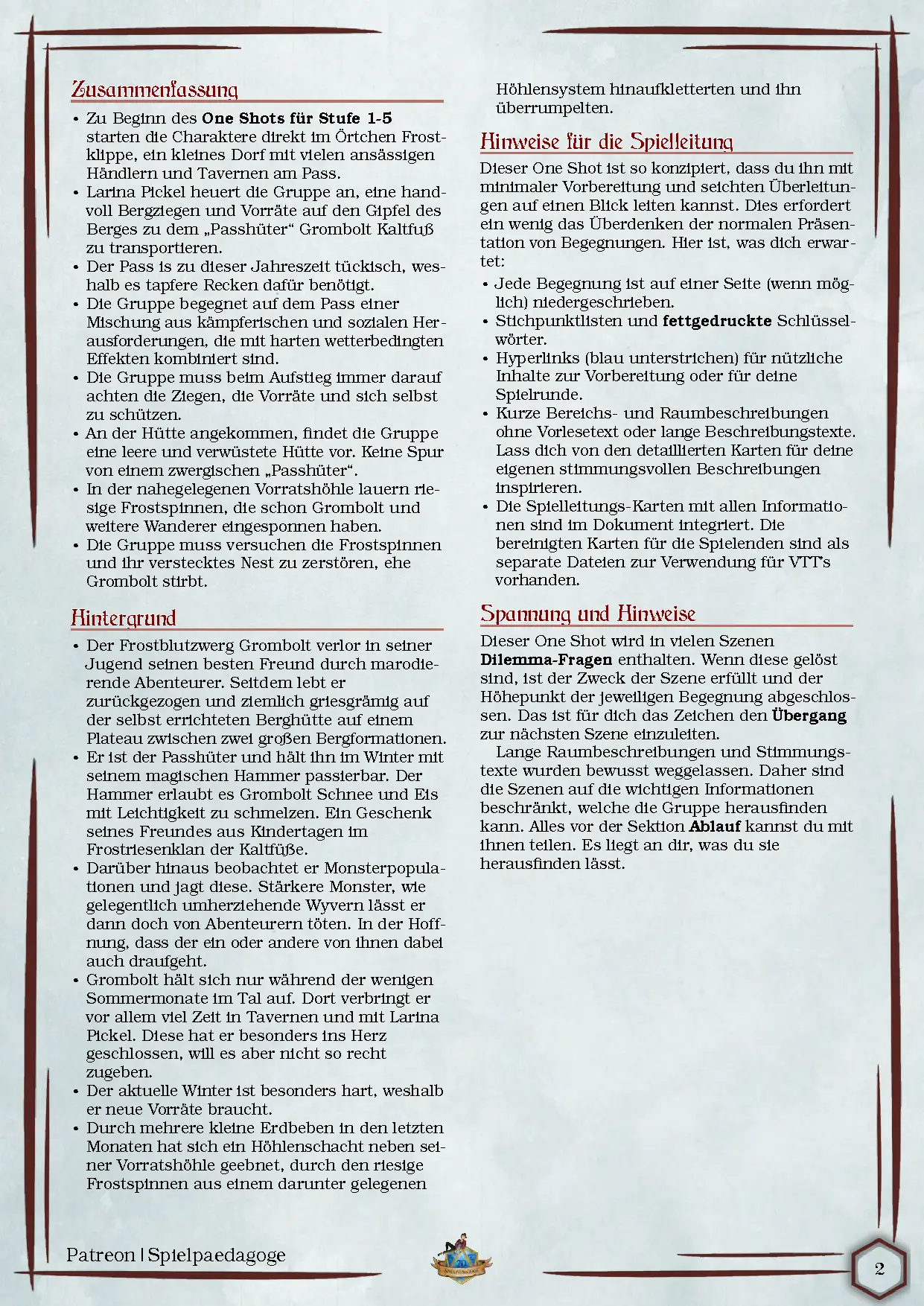 - 2 ausgearbeitete NPCs: Larina Pickel (Halbling-Händlerin), Grombolt Kaltfuß (zwergischer Passwächter)